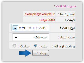 2. در این مرحله نوع اکانت ، مدت اعتبار را انتخاب کرده و گزینه ی پرداخت را انتخاب کنید تا به صفحه بانک هدایت شوید.